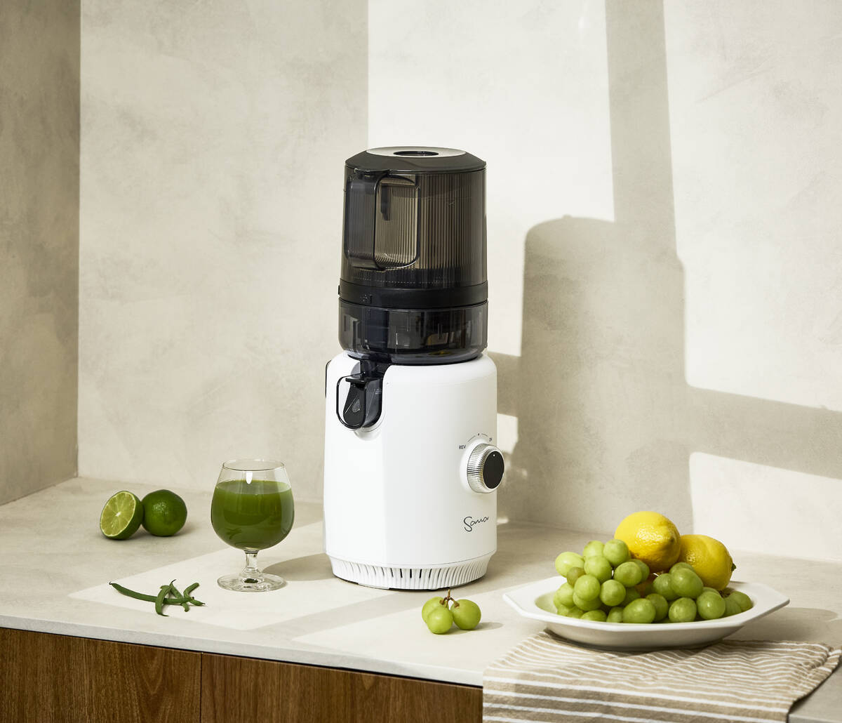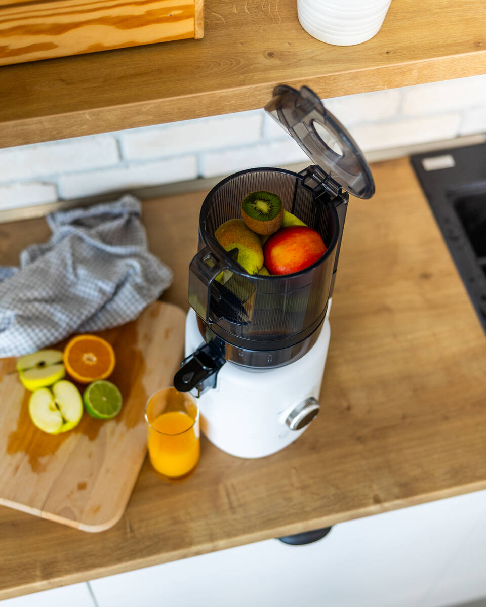 Compact and easy to use, the Sana 818 has a modern design that fits in any kitchen. Just fill the 1600 ml hopper with produce and let the juicer do the rest.