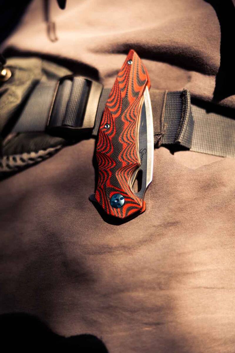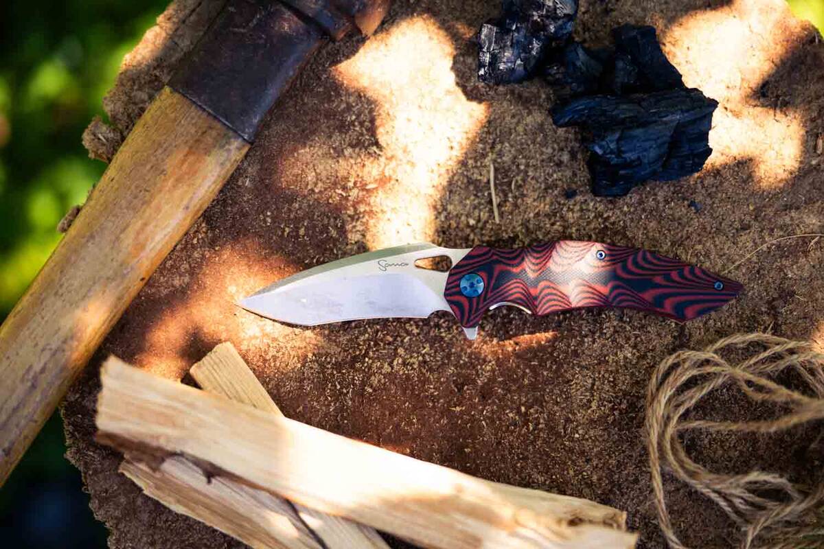 Crafted from G10 fiberglass composite, the handle is tough, weather-resistant, and designed for a secure grip in all conditions. The red and black layered design matches the rest of the Sana premium knife collection, making it as stylish as it is functional.