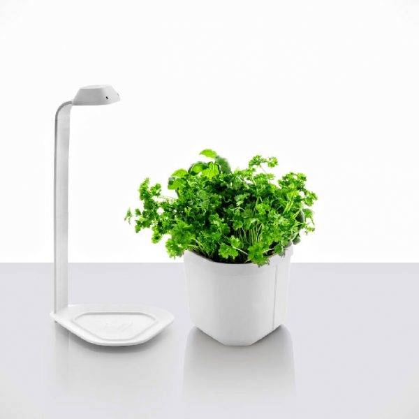 The GENIE indoor garden was designed in Finland by Sebastian Jansson. The compact and contemporary design of Genie brings urban hydroponic gardening to every home. Because it is completely self-contained and has integrated lights, it is suitable for any room. Thanks to hydroponic technology, you can fit more plants in a smaller space. The GENIE system can fit up to three 8 cm cm pots at once, or one large 15 cm pot. It is also useful for growing and maintaining store-bought potted herbs at home. These usually die within a few days after purchase, but in our experience they grow and thrive in the GENIE system.